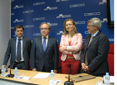 En el acto de presentación de la Agencia y su plataforma online participan el secretario general de CECO, Antonio Díaz, la directora provincial del Servicio Público de Empleo Estatal, Isabel Prieto, el secretario provincial del Servicio Andaluz de Empleo, José Luis Gambra, y el responsable del Gabinete de Asesoramiento Tecnológico de la Confederación, Joaquín Gómez.